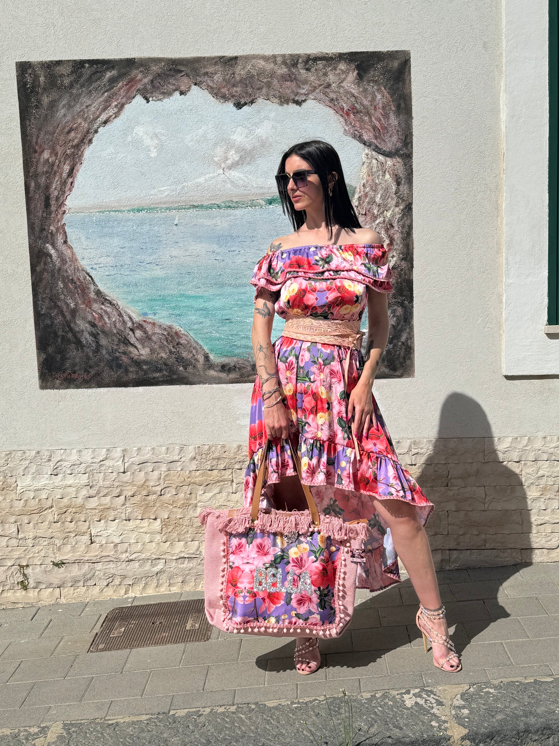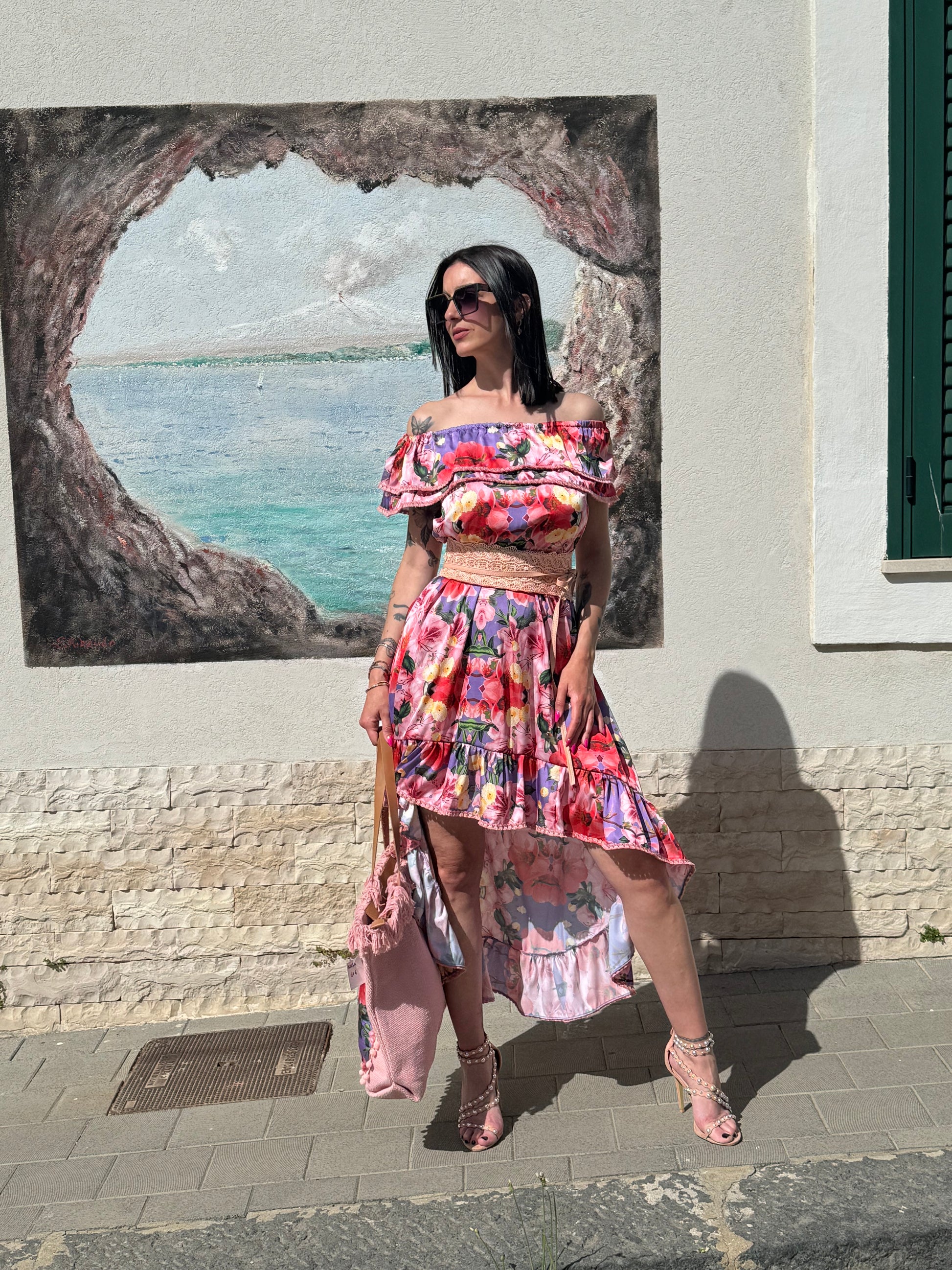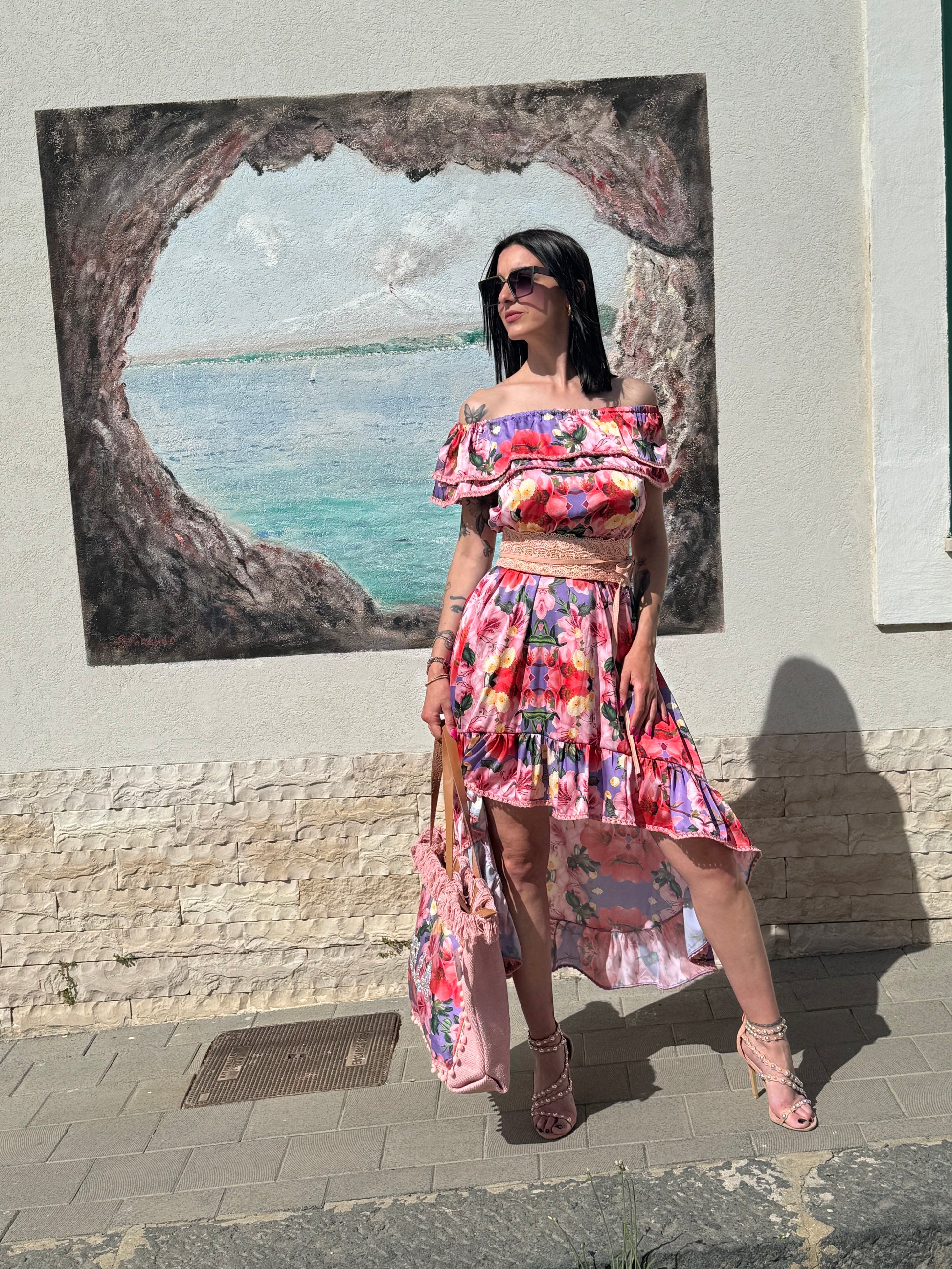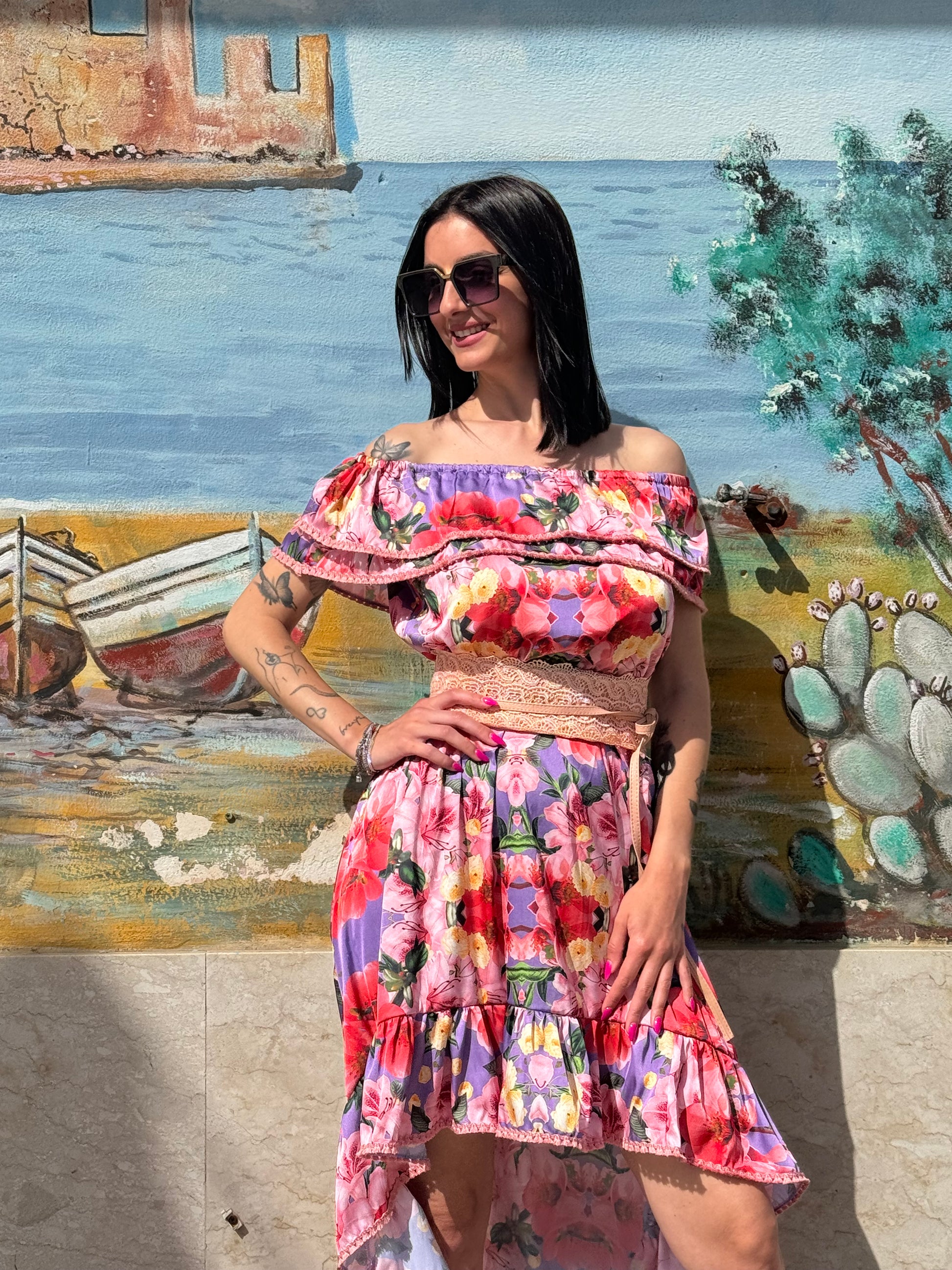 Abito in raso stampato corto davanti e lungo dietro vestibilita 40/46