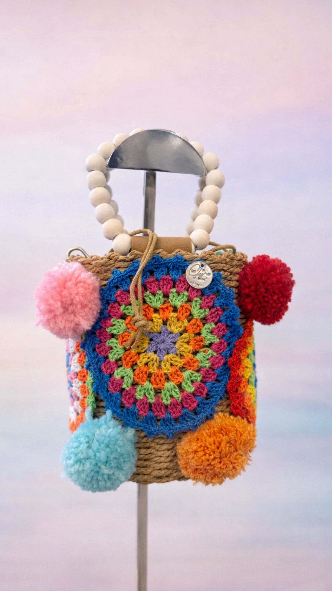 Mini bag di paglia con inserti uncinetto e pon pon fatti a mano
