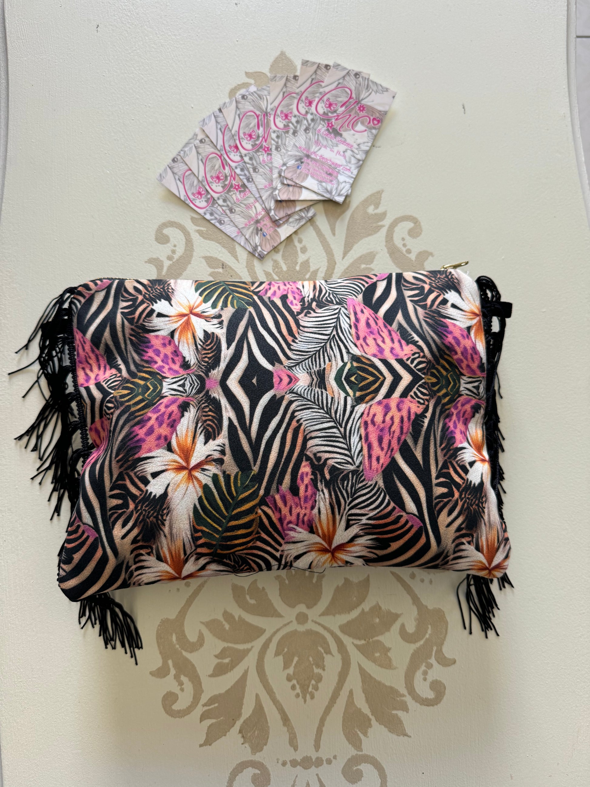 Pochette in tessuto stampato con frange zip e catena tracolla